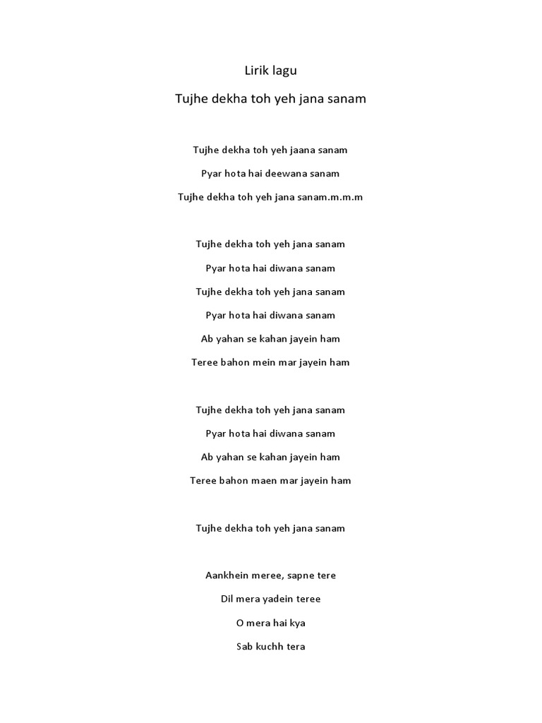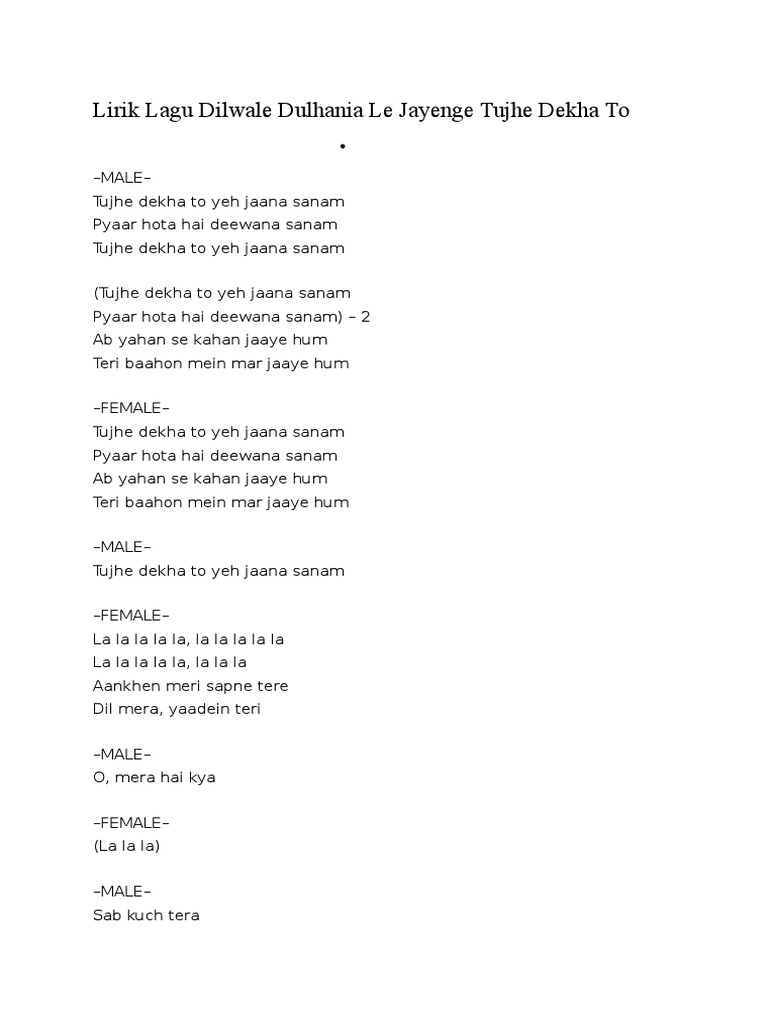 Lirik Lagu Dilwale Dulhania Le Jayenge Tujhe Dekha To Lalaala lalalala aankhen meri sapne tere dil mera yaadein teri o mera hai kya sab kuch tera everything jaan teri saansein teri meri aankhon mein aansu tere aa gaye muskuraane lage saare gham tujhe dekha to yeh jaana sanam pyaar hota hai deewana sanam ab yahan se kahan jaaye hum teri.
